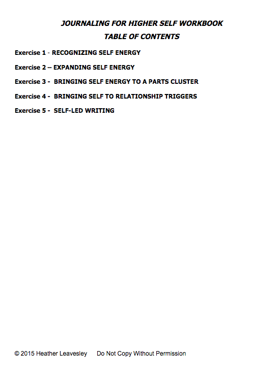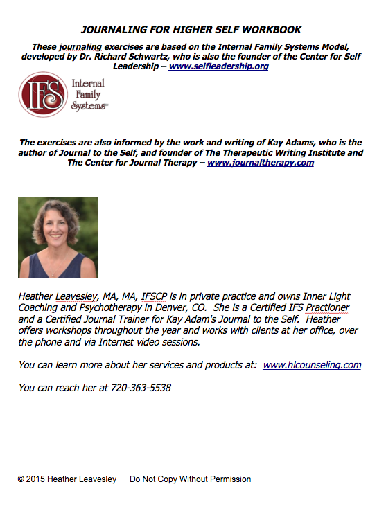 This workbook provides different writing exercises to explore accessing your Higher Self. It is based on the Internal Family Systems model, and is for anyone who is interested in getting to know your inner wisdom, and in learning how to use writing to become more grounded and centered. The workbook is a wonderful way to deepen your spiritual practice, enhance your ability to be your best self in relationships, and develop tools for working with emotionally charged issues.